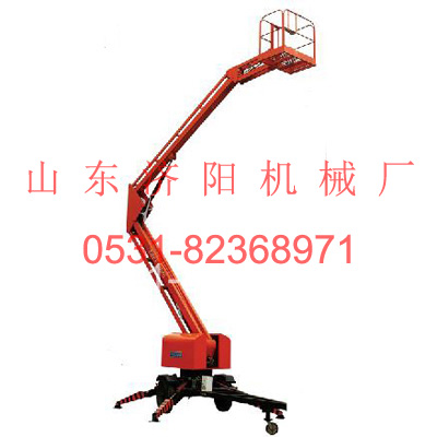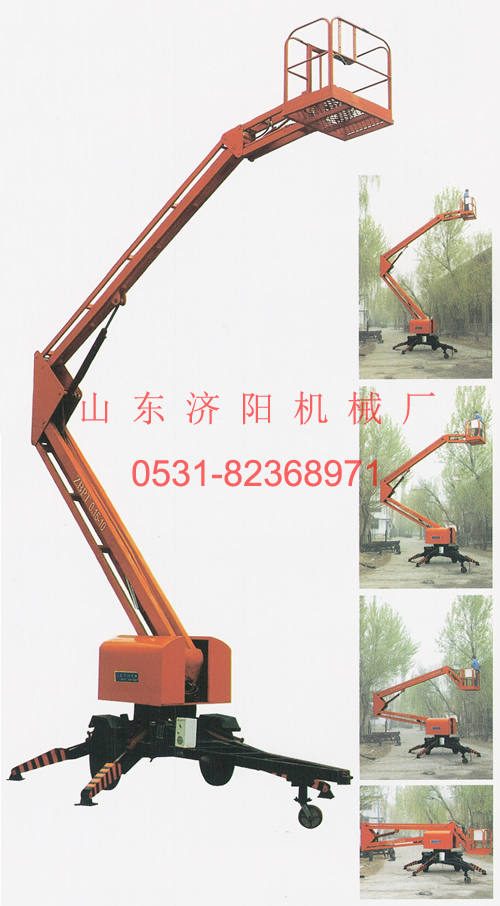 該系列升降機主要用于室外高空作業。折臂結構緊湊,采用新型優質型鋼,強度高、重量輕、架設速度快,具有自動液壓支腿,工作臺既可升高又可水平延伸,還可旋轉。可采用交流電源啟動,易于跨越障礙物到達工作位置,是理想的登高作業設備。該系列升降機廣泛用于市政、電力、路燈、公路、碼頭、廣告、廠礦車間大范圍作業。